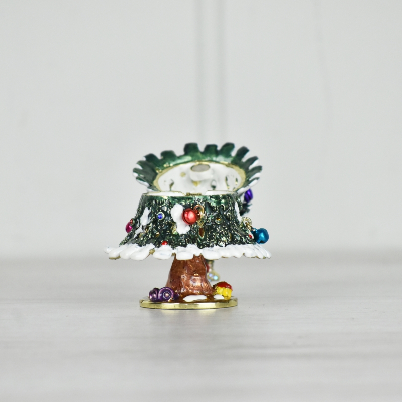 Substantial trinket box in the shape of a christmas tree complate with star on top and moveable baubles. Diamante accents and a white interior. Made of enamelled metal. Not suitable for small children.